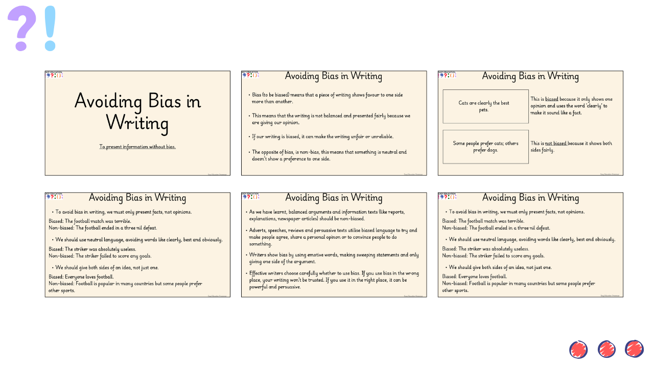 This comprehensive pack helps UKS2 pupils understand the difference between biased and non-biased writing, equipping them with the skills to write fairly and factually. The teaching PowerPoint introduces the concept of bias with clear examples and interactive activities while the differentiated tasks ensure accessibility for all learners. Tis resource provides opportunities to practise rewriting biased sentences and identifying loaded phrases,.