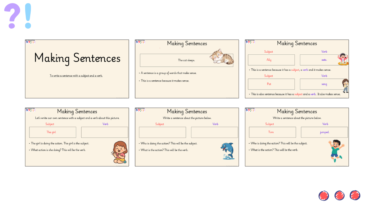 In this fifth lesson, children focus on writing simple sentences by joining a subject with a verb. The PowerPoint explains what a subject is, what a verb is and models how they work together to form complete sentences. Pupils are guided through clear examples before creating their own sentences about pictures.