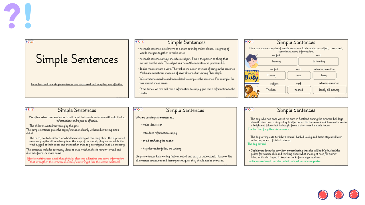 In this lesson, pupils recap how simple sentences are structured and learn how to use them impactfully in writing. Through clear modelling and purposeful examples, children explore how a simple sentence communicates one key idea using a single clause. They learn when simple sentences create clarity, when they add impact, and when longer, multi-clause sentences are more useful. The lesson guides pupils to identify, construct and apply simple sentences with control, before using them deliberately in their own writing. Differentiated tasks support all learners in building confidence and using simple sentences for purpose and effect.