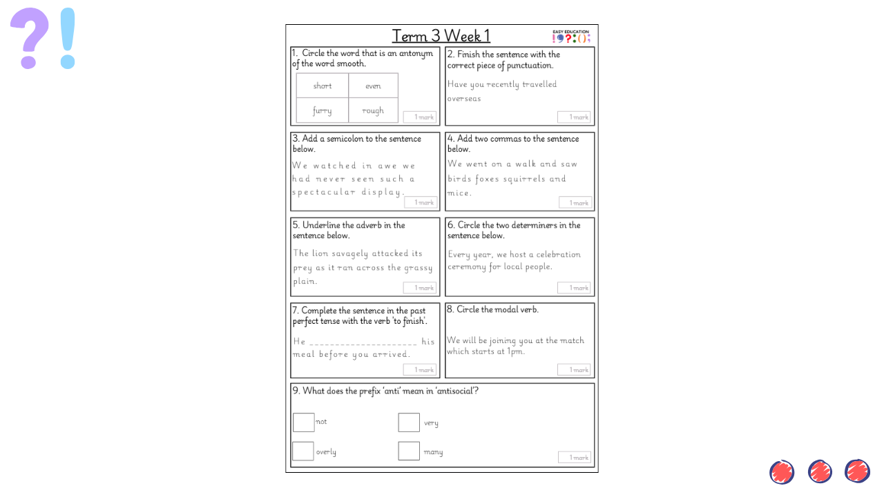 Our weekly tests are designed to provide children with regular opportunities to practise key grammar, punctuation and spelling skills. Each sheet includes a carefully chosen set of short questions that cover essential curriculum objectives, reinforcing knowledge through consistent practice.
