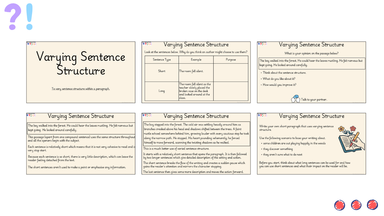 In this lesson, children learn how varying sentence length can create impact, build tension and improve the flow of their writing. Through clear modelling, pupils explore how longer sentences add description and detail while shorter sentences can be used deliberately to shock the reader or emphasise key moments. The lesson guides children in analysing effective examples before composing their own paragraph using both long and short sentences for purpose. Differentiated tasks support all learners in applying the skill confidently and independently.