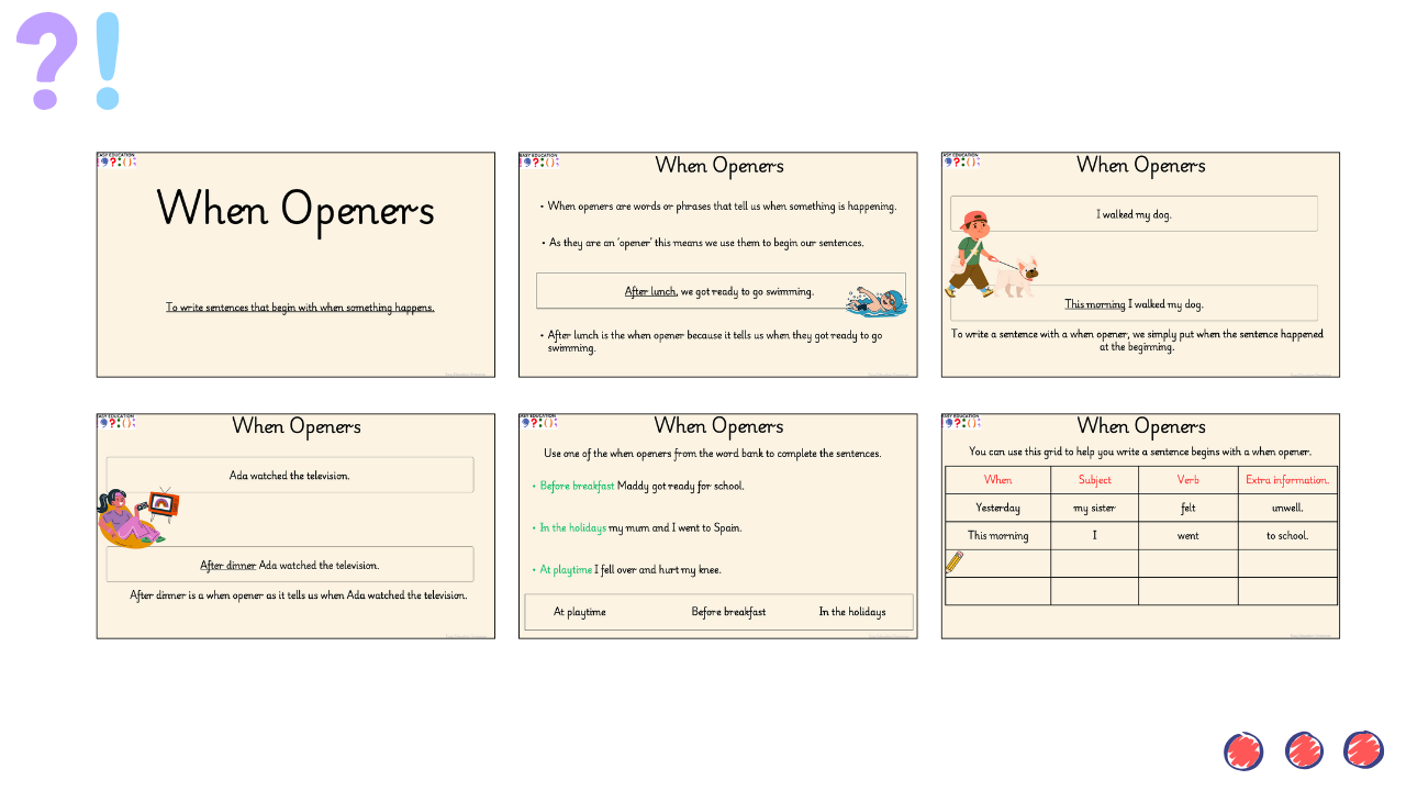 This resource introduces children to the use of when openers, helping them understand how starting sentences with time phrases can make writing clearer and more organised. Through clear explanations, guided examples and interactive activities, pupils learn how to begin sentences with words and phrases such as yesterday, before lunch and in the holidays. Designed with differentiated tasks to support a range of abilities, this pack shows children how when openers can be used in stories, diaries and recounts to order events and engage the reader, while giving them plenty of opportunities to practise writing their own.